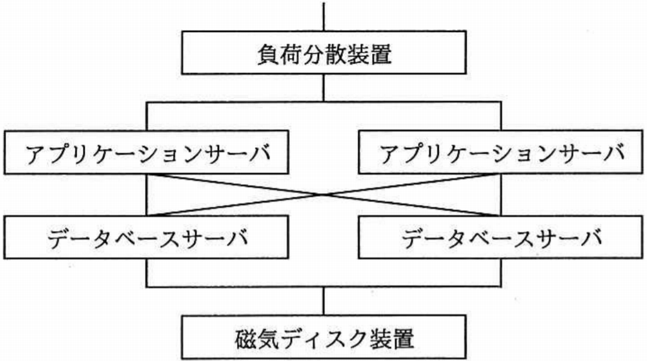 4種類の装置で構成される次のシステムの稼働率は, およそ幾らか。 ここで, アプリケーションサーバとデータベースサーバの稼働率は0.8であり, それぞれのサーバのどちらかが稼働していればシステムとして稼働する。 また, 負荷分散装置と磁気ディスク装置は, 故障しないものとする。